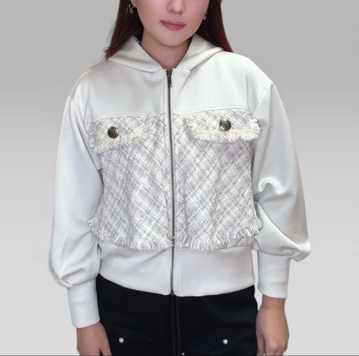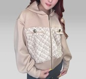 ツイードと弾力のあるボンディング素材を融合させたフーディーです。レディライクさとカジュアルさを兼ね備えています。日常から特別な場面まで幅広く活躍します。